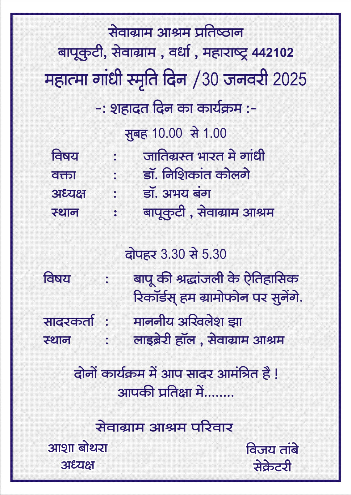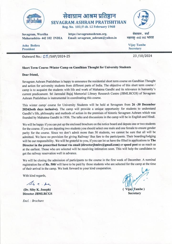 The valedictory Session of the International Online Fellowship Program on Nonviolence and Peace organized by Sevagram Ashram Pratishthan in association with Gandhi International,France; Academic University College for Non-Violence Lebanon;MGM University Aurangabad; International Centre for Non-violence ,Durban University of Technology, Portland Community College, Oregon will be held on January 30, 2025. The program was commenced on October 2, 2024. The Library and Research Centre of Sevagram Ashram Pratishthan was instrumental in coordinating the program.