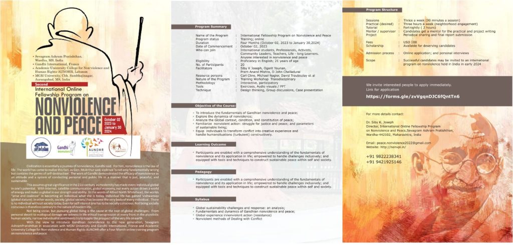 Sevagram Ashram Pratishthan, India, in association with MGM University, India,Academic University College for Non-violence and Human Rights- AUNHOR, Lebanon and Gandhi International, France offers a four-month online International Fellowship Program on Nonviolence and Peace (IFPNP-II) from October 02, 2023 to January 30, 2024.