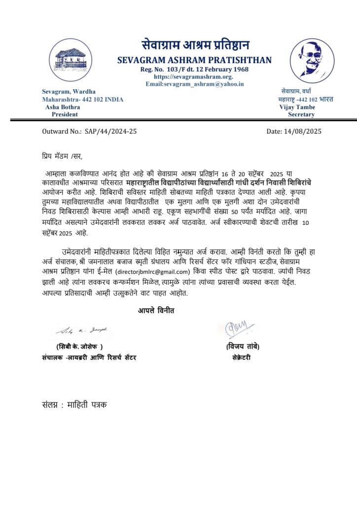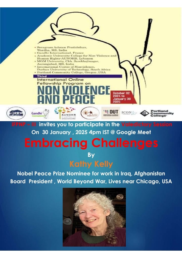The valedictory Session of the International Online Fellowship Program on Nonviolence and Peace organized by Sevagram Ashram Pratishthan in association with Gandhi International,France; Academic University College for Non-Violence Lebanon;MGM University Aurangabad; International Centre for Non-violence ,Durban University of Technology, Portland Community College, Oregon will be held on January 30, 2025. The program was commenced on October 2, 2024. The Library and Research Centre of Sevagram Ashram Pratishthan was instrumental in coordinating the program.